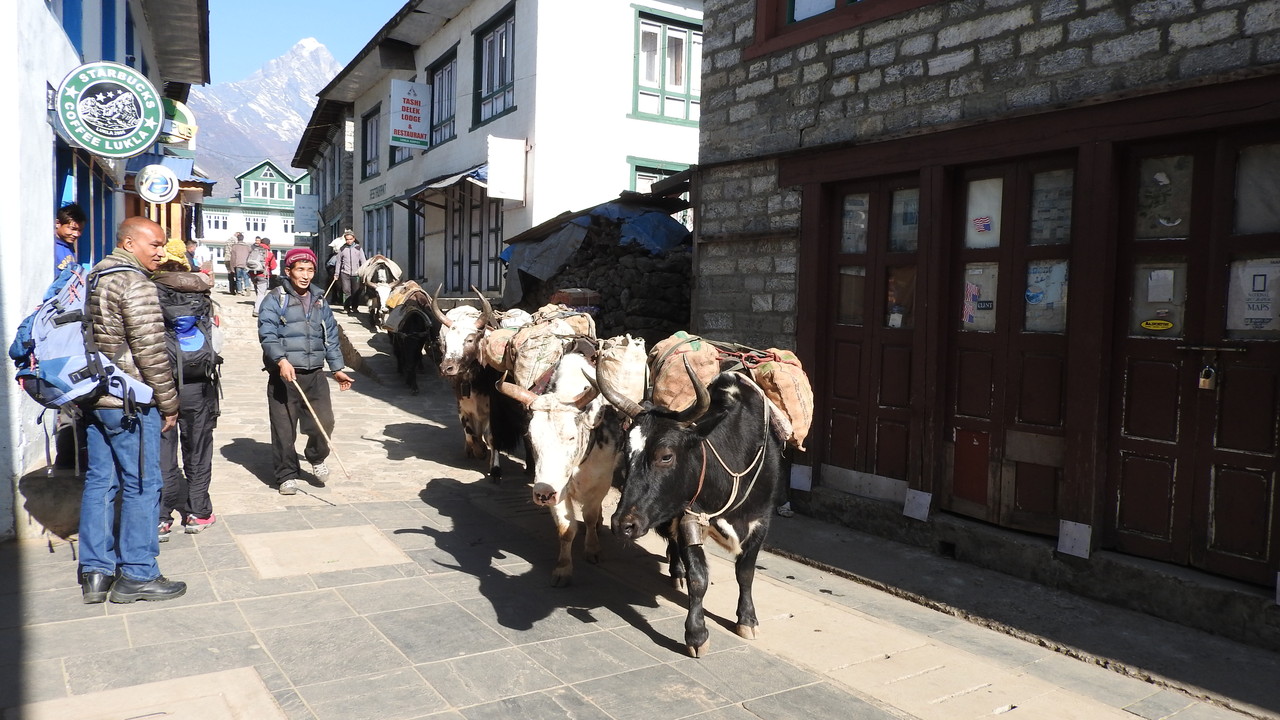 町の商店街の中を大きな角を持ったゾッキョ(牛とヤクの交配種)の動物が、たくさんの荷物を背に歩いてきました。