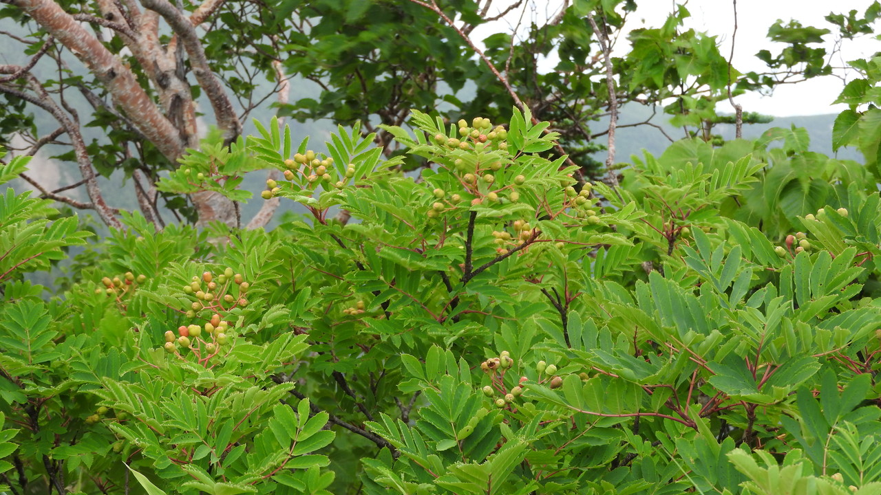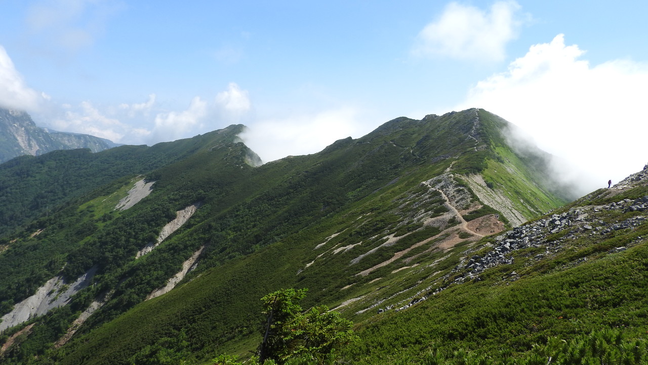 今日、歩いて来た爺が岳の峰も見えてきました。