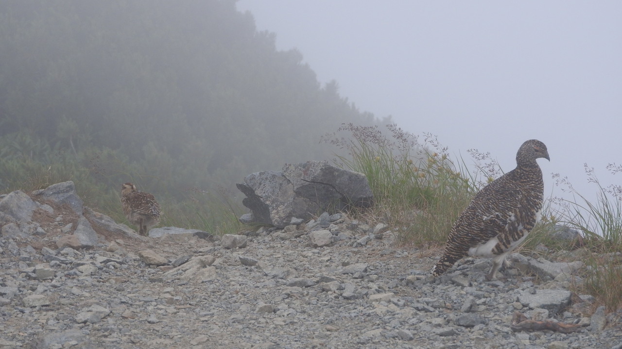 雷鳥の親子は食事を終えると、霧の中に消えていきました。
